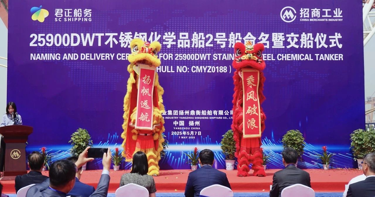 5月7日,君正船務(wù)在招商局工業(yè)集團(tuán)揚(yáng)州鼎衡船舶有限公司的第二艘25900載重噸不銹鋼化學(xué)品船命名暨交船儀式在揚(yáng)州隆重舉行。